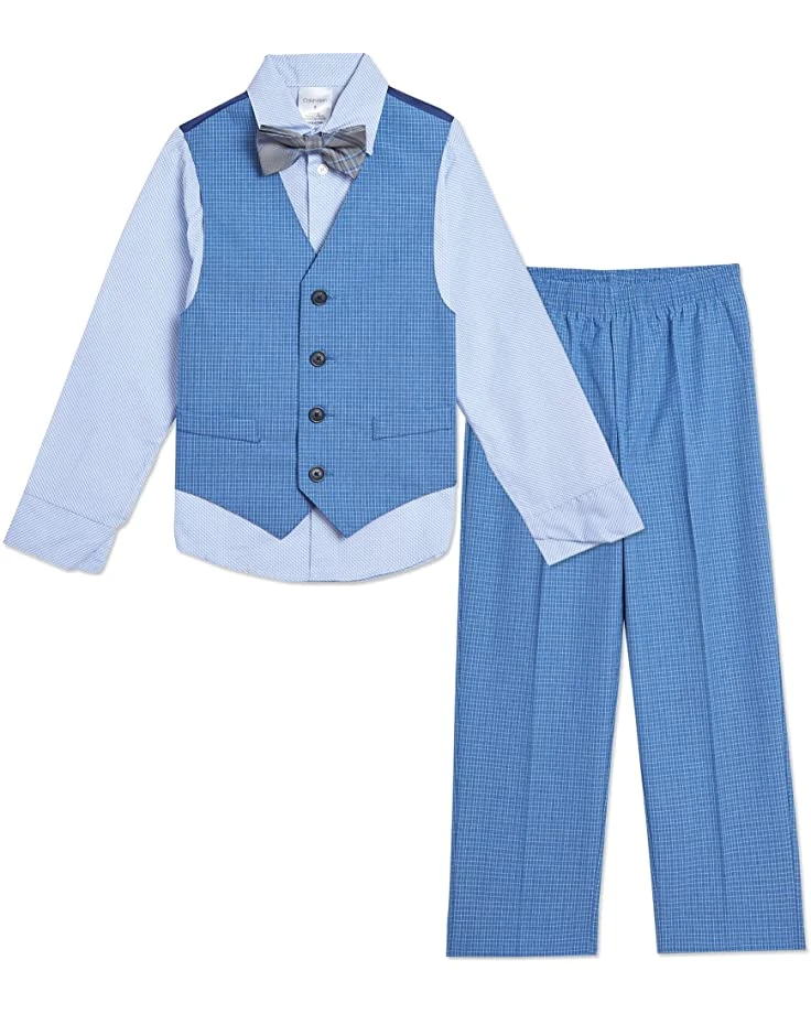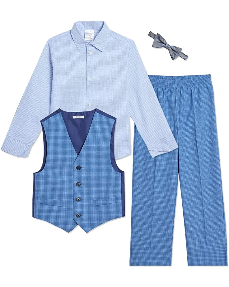 - Dress your young gentleman in this adorable vest set from Calvin Klein, featuring a textured vest and dress pants with patterned shirt and blue tie.