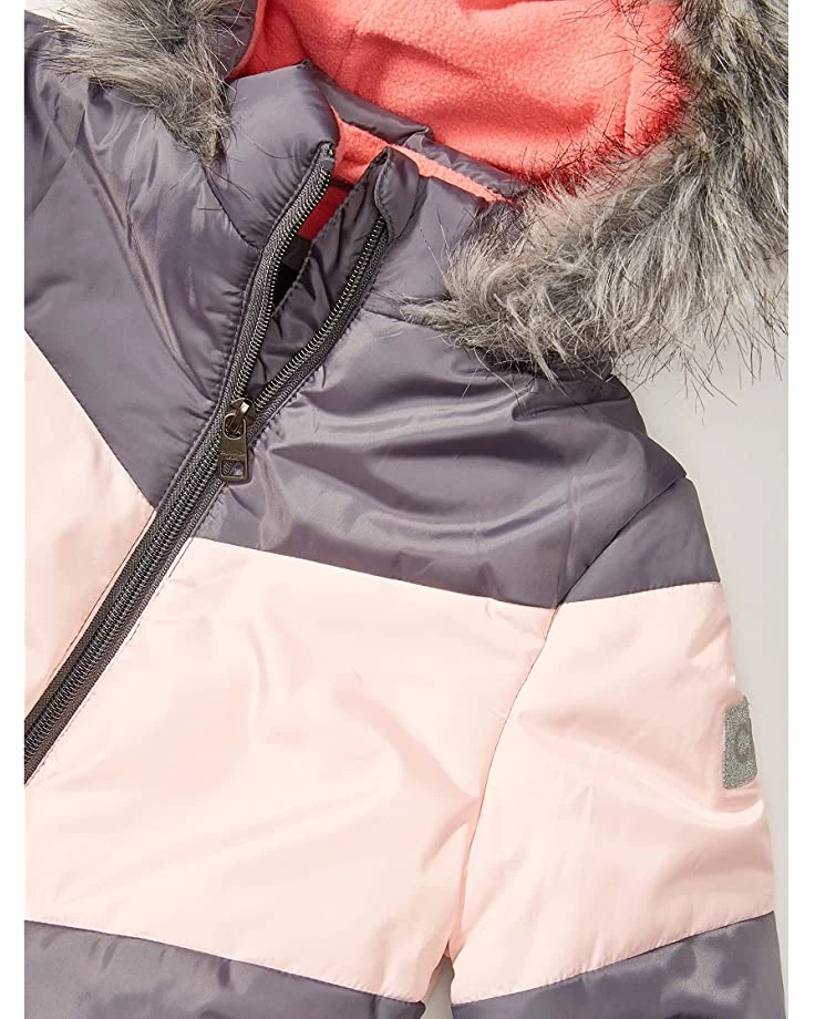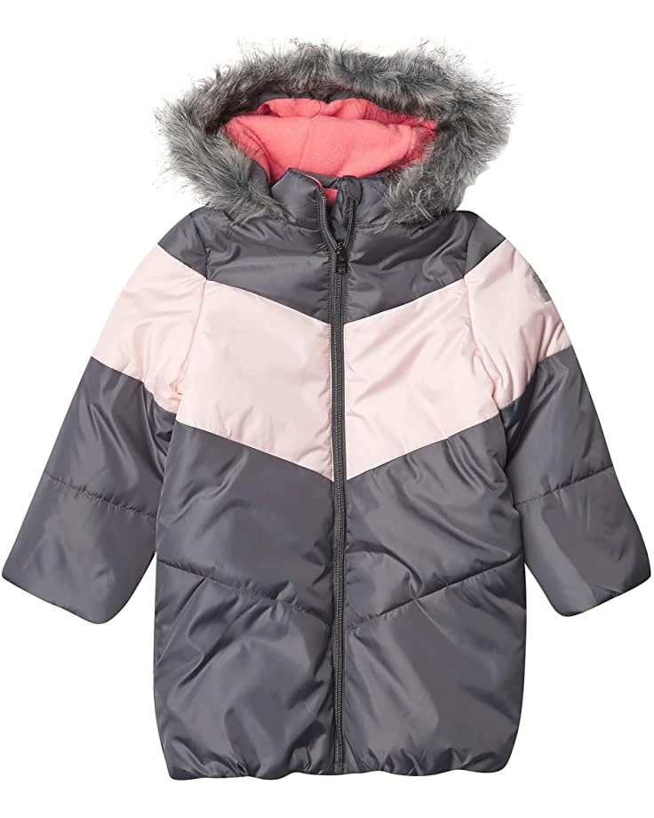 - Features This girls 30″ long length heavyweight jacket is water resistant, high gloss cire, 8 oz polyfill + micro fleece lining, oversized vislon zippers, logo taping, glitter patch on left arm, faux fur hood