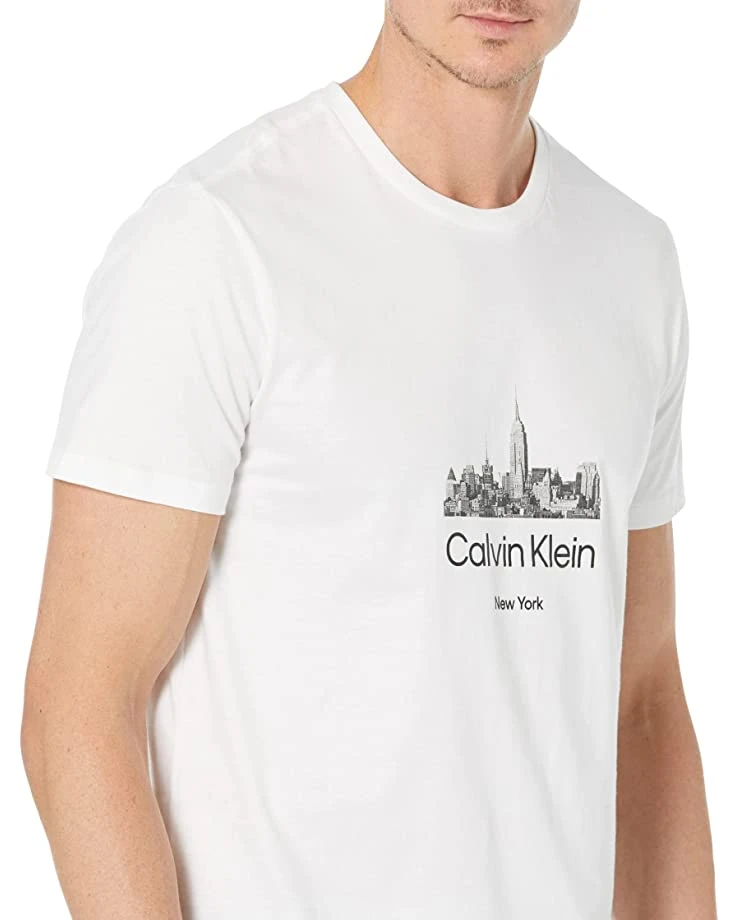 - Maintain your laid-back vibes in the Calvin Klein® Short Sleeve Skyline NY Logo Crew Neck Tee.