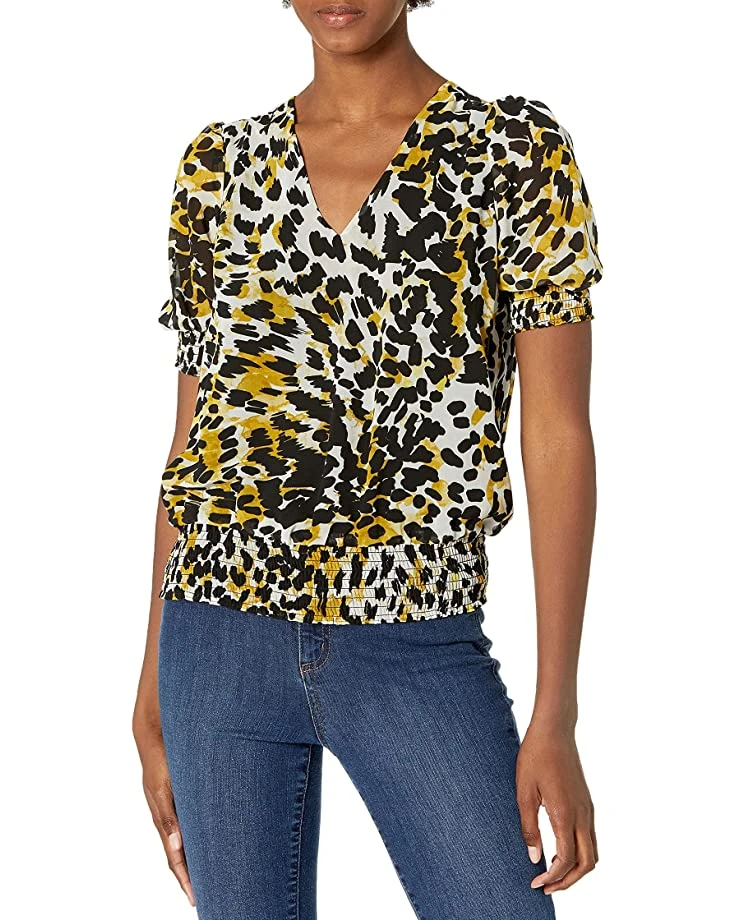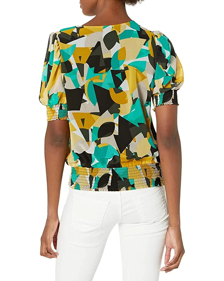 Calvin Klein Women’s Printed Short Sleeve V Neck Blouse with Smocking | Shirts & Tops
